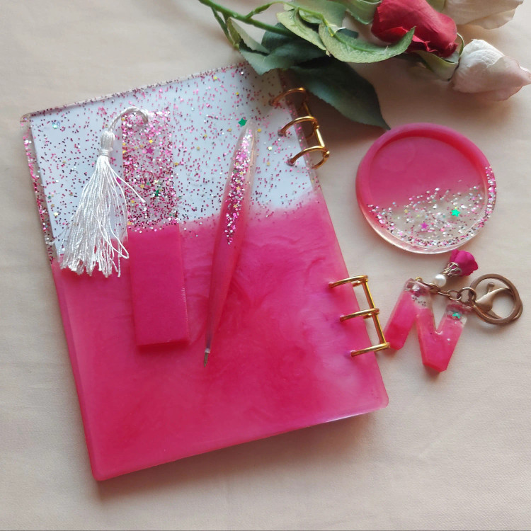 ست هدیه رزینی شیک و زیبا و لاکچری مناسب خاص پسندان شامل:خودکار،زیرلیوانی،جاکلیدی حرف لاتین،بوک مارک و دفتر با جلد کلاسوری وکاغذ بیخط تعداد و تم به دلخواه مشتری قابل تغییر است.