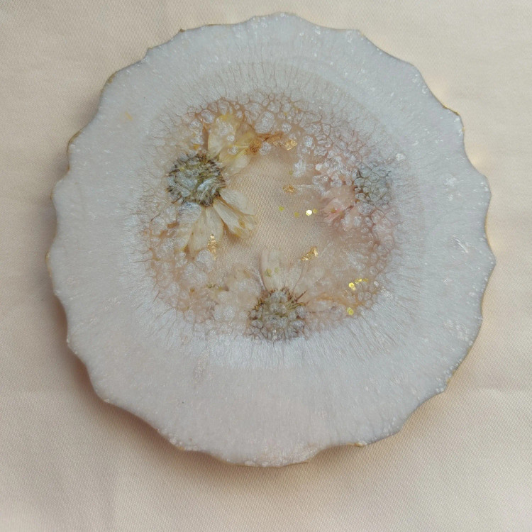 زیرلیوانی رزینی تم بابونه استفاده شده از گلهای بابونه رنگی ورق طلا و اکلیل